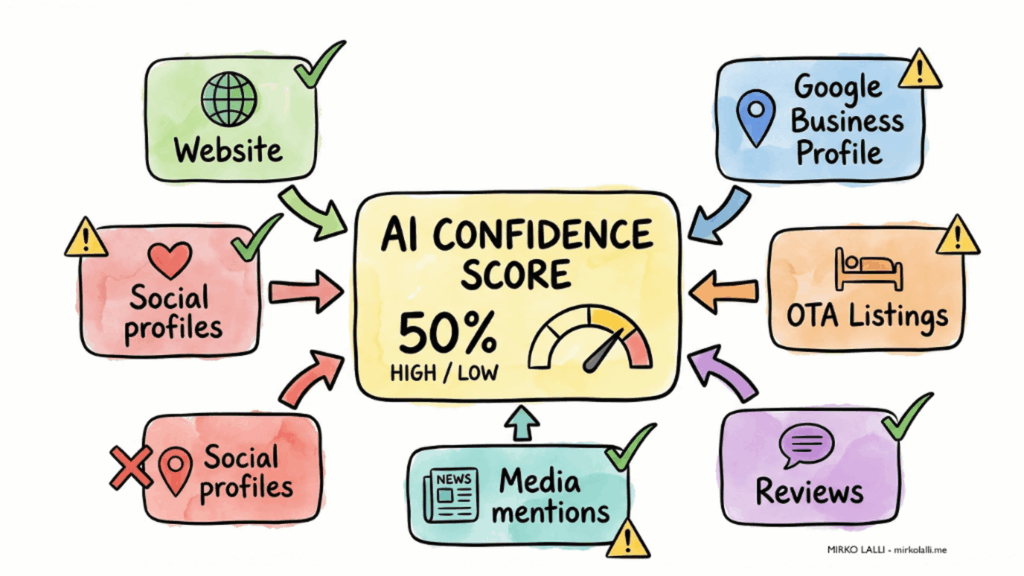 Un modello AI costruisce la sua “opinione” su una struttura ricettiva confrontando ciò che trova. Il tuo sito dice che hai un centro benessere. La tua scheda su Booking.com non lo menziona. La tua Google Business Profile ha ancora gli orari del 2022. La descrizione su Expedia è quella che hai scritto quando hai aperto la struttura e che non hai più toccato.