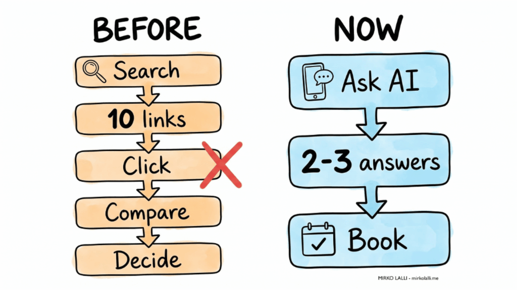 È il momento in cui apre un’app sul telefono, digita una domanda in linguaggio naturale e aspetta una risposta. Quella risposta non è una lista di link. È una narrazione. Breve, autorevole, selettiva. Tre hotel. Forse quattro. E gli altri non esistono, non perché siano peggiori, ma perché l’algoritmo non si fidava abbastanza di loro per includerli.