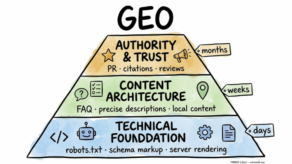 Il primo è tecnico. Assicurarsi che i crawler AI possano leggere il tuo sito. Verificare il file robots.txt e controllare che non blocchi accidentalmente i bot dei principali sistemi AI. Aggiungere un file llms.txt che indichi quali pagine del tuo sito sono le più importanti. Implementare il markup strutturato in formato JSON-LD: tipo di struttura, amenità, location, FAQ, tipologie di camere. Usare rendering lato server invece di JavaScript dinamico per i contenuti critici.