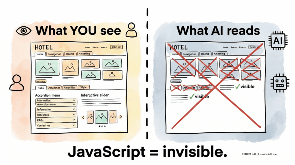 La leggibilità tecnica del tuo sito. I crawler AI non eseguono JavaScript. Questo significa che tutto il contenuto che hai messo in tab interattive, accordion, slider, o elementi caricati dinamicamente, per loro non esiste. Se le tue descrizioni delle camere, le tue politiche, le tue informazioni sulle attrazioni locali sono nascoste dietro interazioni che richiedono un browser moderno e un clic umano, l’AI semplicemente non le vede. Il tuo sito bello e moderno potrebbe essere, per un modello linguistico, quasi vuoto.
